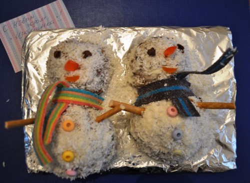 А у нас еще один тортик к новогодне-зимним праздникам, который принимает участие в конкурсе "Поет зима, аукает...": "Снеговички получились экспромтом, но вся семья была в восторге! Очень простой вариант порадовать детей и создать праздничное настроение за столом.