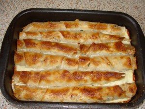 Готовим заливку: Миксером взбиваем молоко, сметану, яйца, оливковое масло, добавляем соль и перец по вкусу, заливаем трубочки и ставим в разогретую духовку до 200С на 30 минут. Как только берег станет золотистым, вытаскиваем его, он готов. Мочим посудное полотенце холодной водой и закрываем формочку с трубочками на 10 минут. Трубочки отмякнут и режем их на порционные куски. Турецкий берек готов, приятного аппетита.