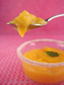 Закипятить воду с апельсиновым соком, добавить соль и всыпать манку. Непрерывно мешая, подержать на небольшом огне в течение 8 минут. Снять с огня, добавить персиковое пюре и сахар и все перемешать. Остудить, добавить ликер, взбить миксером и разложить по креманкам.