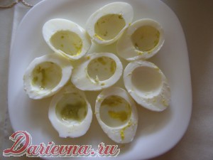 Желтки откладываем в небольшую пиалу, белки выкладываем на блюдо.