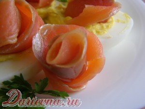 Сверху каждой половинки выкладвыаем закрученные в рулетик ломтики рыбы.