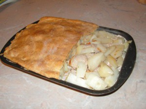 Свинину, мелко порезанный лук и нарезанный кубиками картофель выкладываем в плоскую посуду. Приправляем своими любимыми специями, наливаем немножко воды (примерно на треть глубины). Сверху вместо крышки накрываем тестом. Отправляем у духовку и тушим при температуре 150 градусов полтора часа.