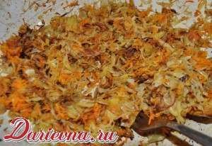 Капусту мелко нашинковать, обжарить на масле до мягкости, смешать с луком и морковкой, при необходимости еще чуть прижарить. Не тушите начинку, она станет водянистой и мокрой. Соль, перец по вкусу.