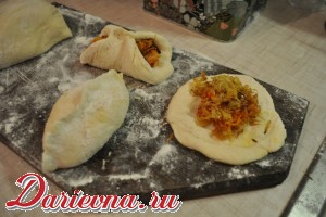 Сформировать лепешку, по центру выложить начинку, края скрепить. Должен получиться пирожок.