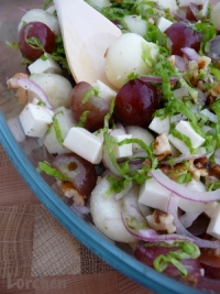 Лариса Умарова прислала нам в рубрику Хвастушки очень интересный салат: здесь есть сыр и орехи, виноград и базилик, а лук подружился без проблем с дыней: