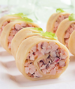 В качестве начинки автор использует копченую куриную грудку и грибы. Хотя, мне кажется, ингредиенты можно и изменить. Например, с морепродуктами - креветками, кальмарами - будет тоже хорошо. Главное - это идея, как расплавить сыр и завернуть его в рулет.