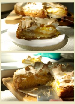 Великолепная идея-основа для создания пирогов из песочного теста с любыми фруктами. Вместо груш и апальсинов можно взять клубнику, персики, абрикосы, можно эксперементировать с сочетанием яблок с другими фруктами, можно "играться" с ревенем и тыквой, крыжовником и вишнями! Кстати, о вишнях. Вы представляете себе ЭТОТ вкус? Тоненькая хрустящая основа на сливочном масле, мясистые вишни, утопающие в сиропе, белковая "шапка"... Это же просто изумительно! А кроме того - быстро, легко, красиво!
