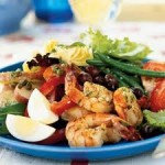 Нестандартное сочетание - спаржа, грибы, креветки. Да еще и с луком, помидорами и яйцом.